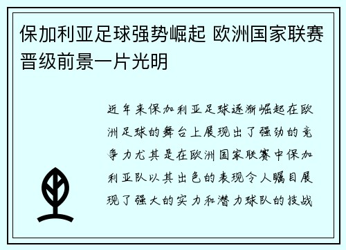 近年来,保加利亚足球逐渐崛起,在欧洲足球...