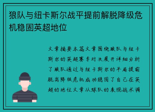 文章摘要:本篇文章围绕狼队与纽卡斯尔的英...