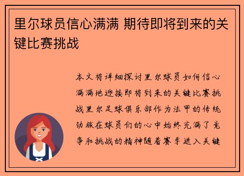 本文将详细探讨里尔球员如何信心满满地迎接...